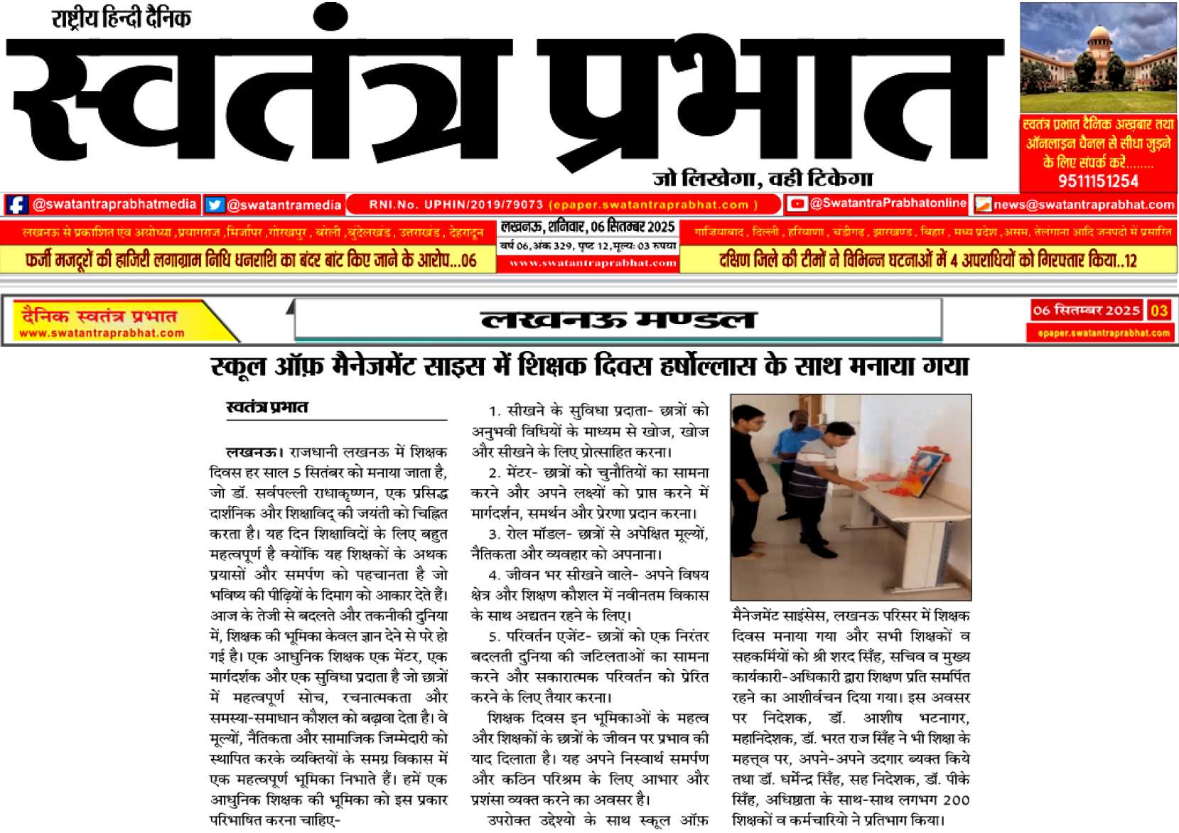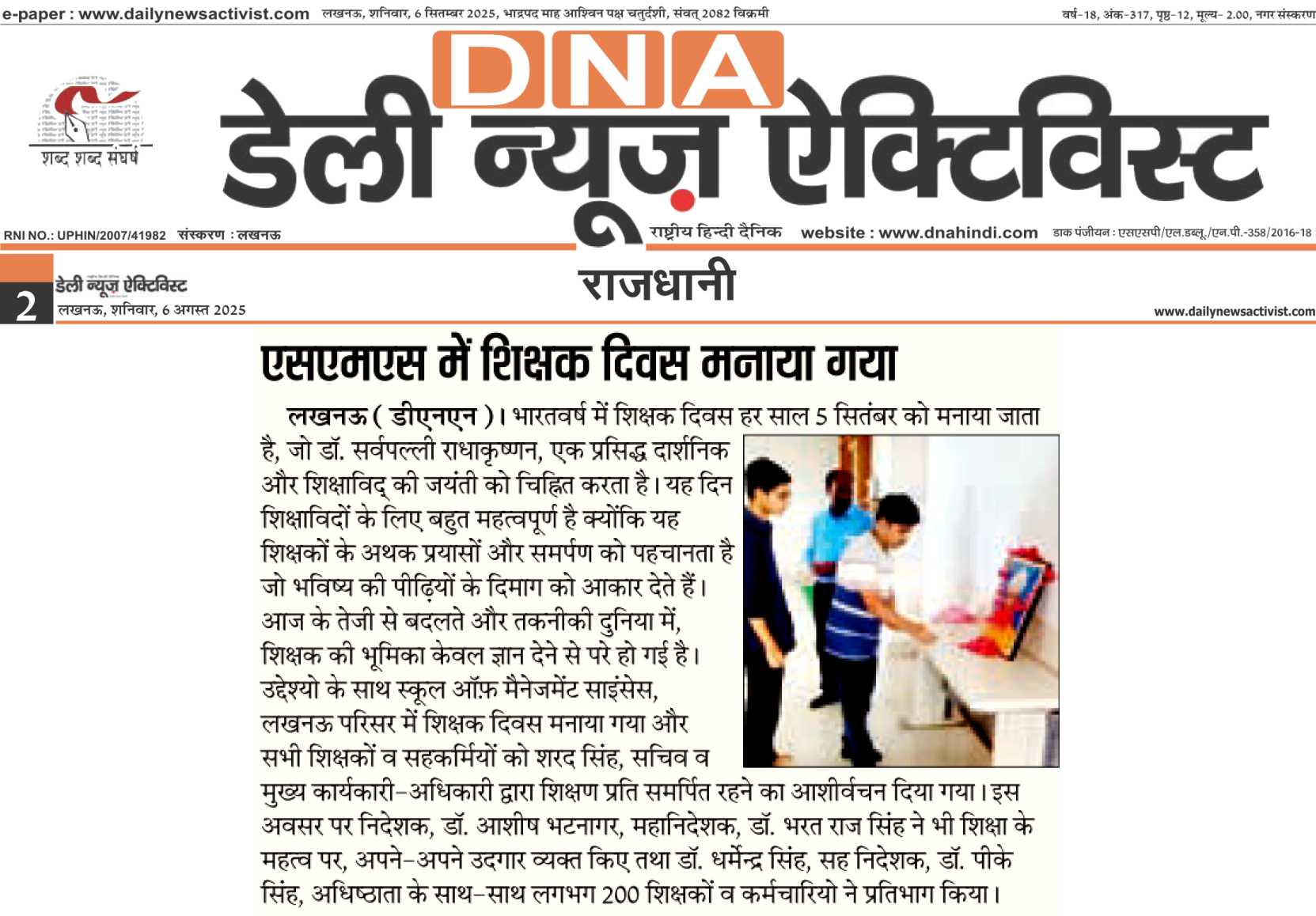 Teacher's Day was celebrated at School of Management Sciences, Lucknow on 05th Sep 2025 .A modern teacher is a mentor, guide, and facilitator who nurtures critical thinking, creativity, and problem-solving skills among students. By instilling values, ethics, and social responsibility, they play a vital role in the holistic development of individuals.In alignment with these objectives, Teachers’ Day was celebrated at the School of Management Sciences, Lucknow campus, where Mr. Sharad Singh, Secretary and Chief Executive Officer, blessed all the teachers and colleagues with words of encouragement for their continued dedication to teaching. On this occasion, Dr. Ashish Bhatnagar, Director, and Dr. Bharat Raj Singh, Director General, also expressed their views on the importance of education. Along with them, Dr. Dharmendra Singh (Associate Director), Dr. P.K. Singh (Dean), nearly 200 faculty members