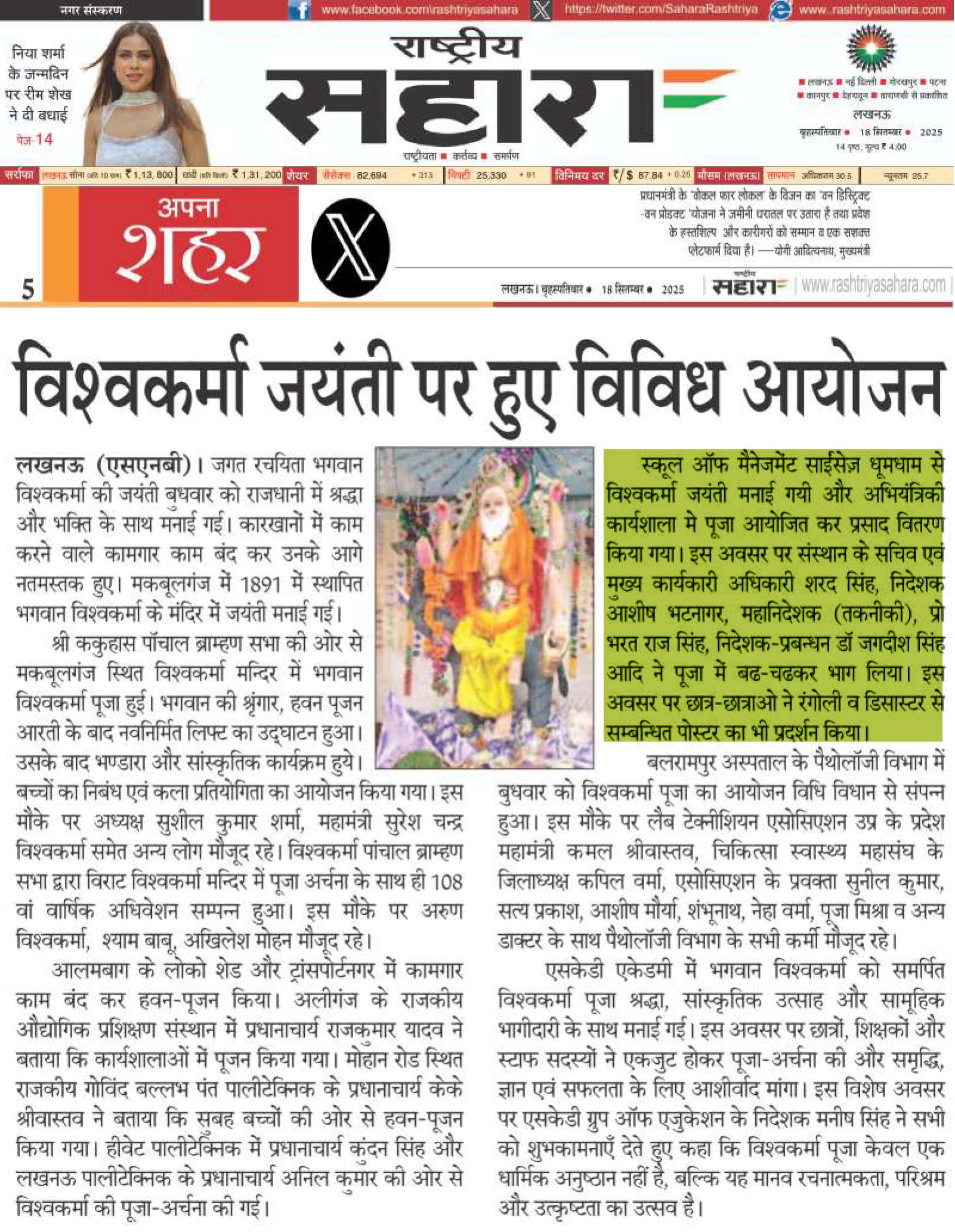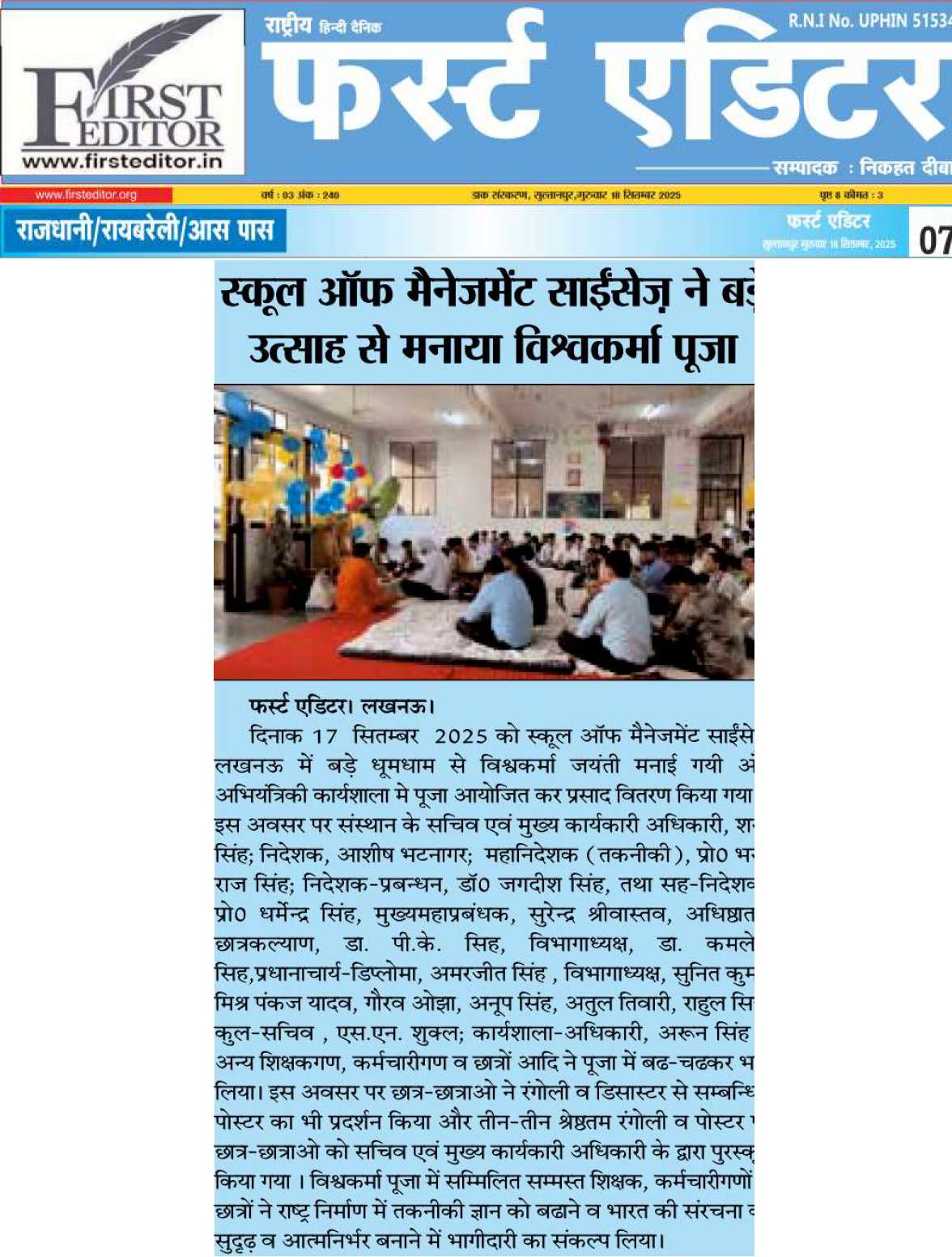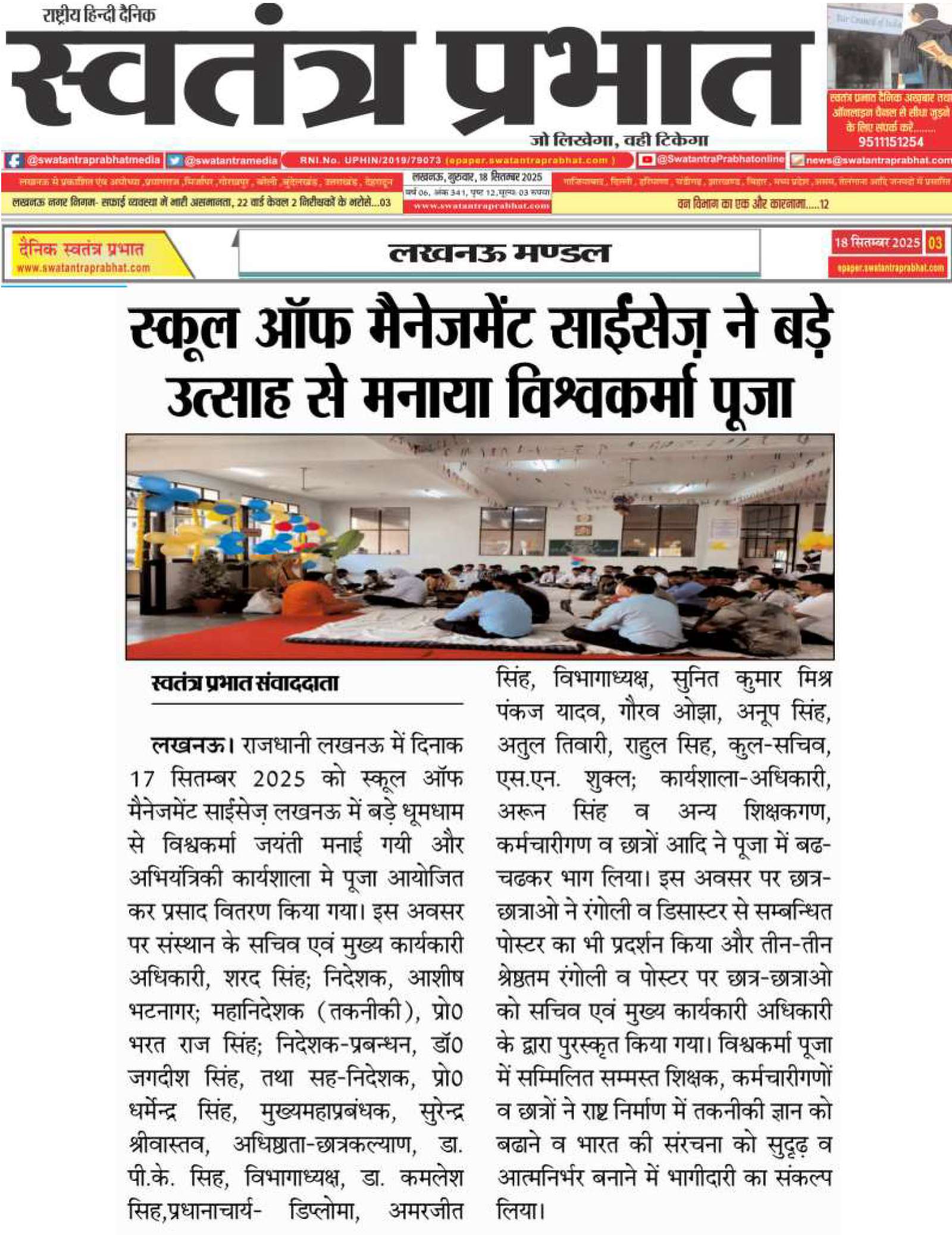 School of Management Sciences, Lucknow celebrated Vishwakarma Jayanti with great enthusiasm on 17 Sep 2025. A special worship ceremony was organized in the Engineering Workshop, followed by the distribution of prasad.