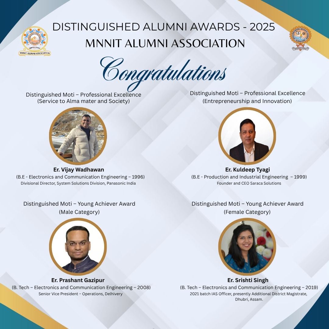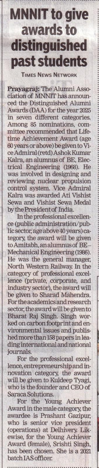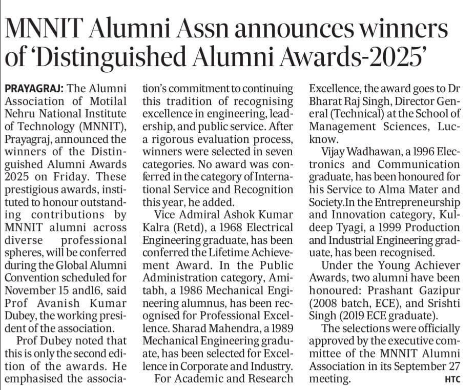 Prof. Bharat Raj Singh recieved email with Greetings from MNNIT Alumni Association (MAA). Vice President-I, MAA,Prayagraj, Prof. Avinash Kumar Deubey on 30 Sep 2025. He also issued the notification regarding Distinguished Alumni Awards – 2025.