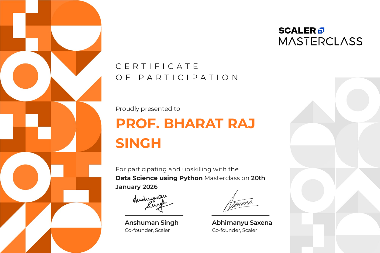 Jan-Feb 2026:: SCALER: Data Science vs Machine Learning vs Artificial Intellegence- 03 Jan 2026 / SCALER: Data Science using Python- 06 Jan 2026 / SCALER: Transition to Non Data Science to Data Science Roles- 08 Jan 2026 / SCALER: MS OPs Fundamentals- 10 Jan 2026 /