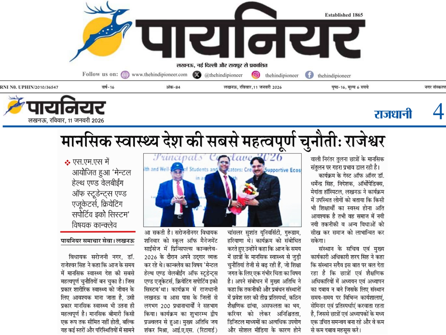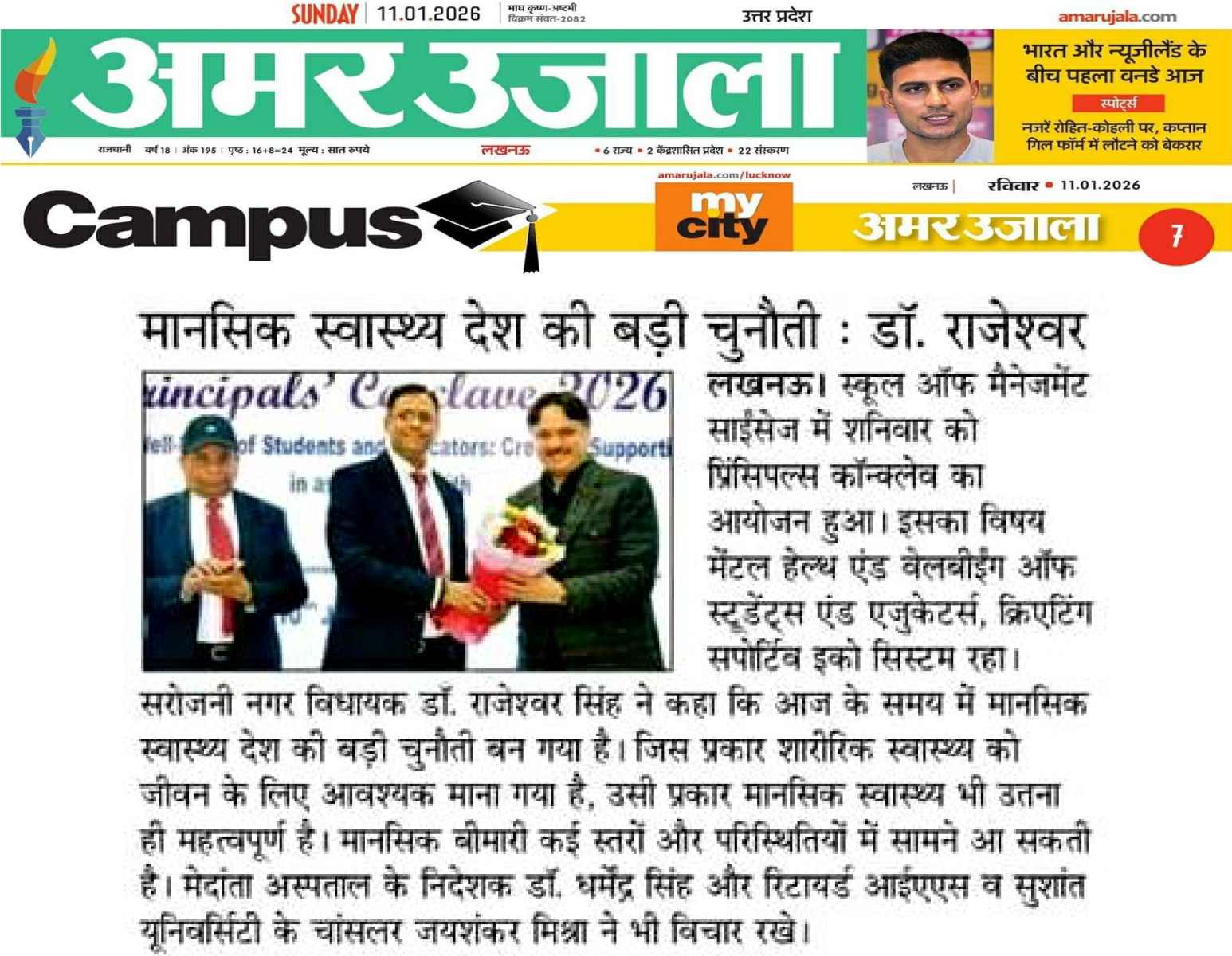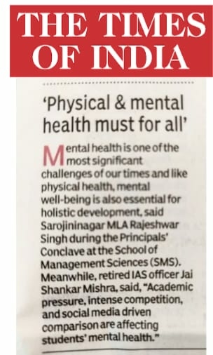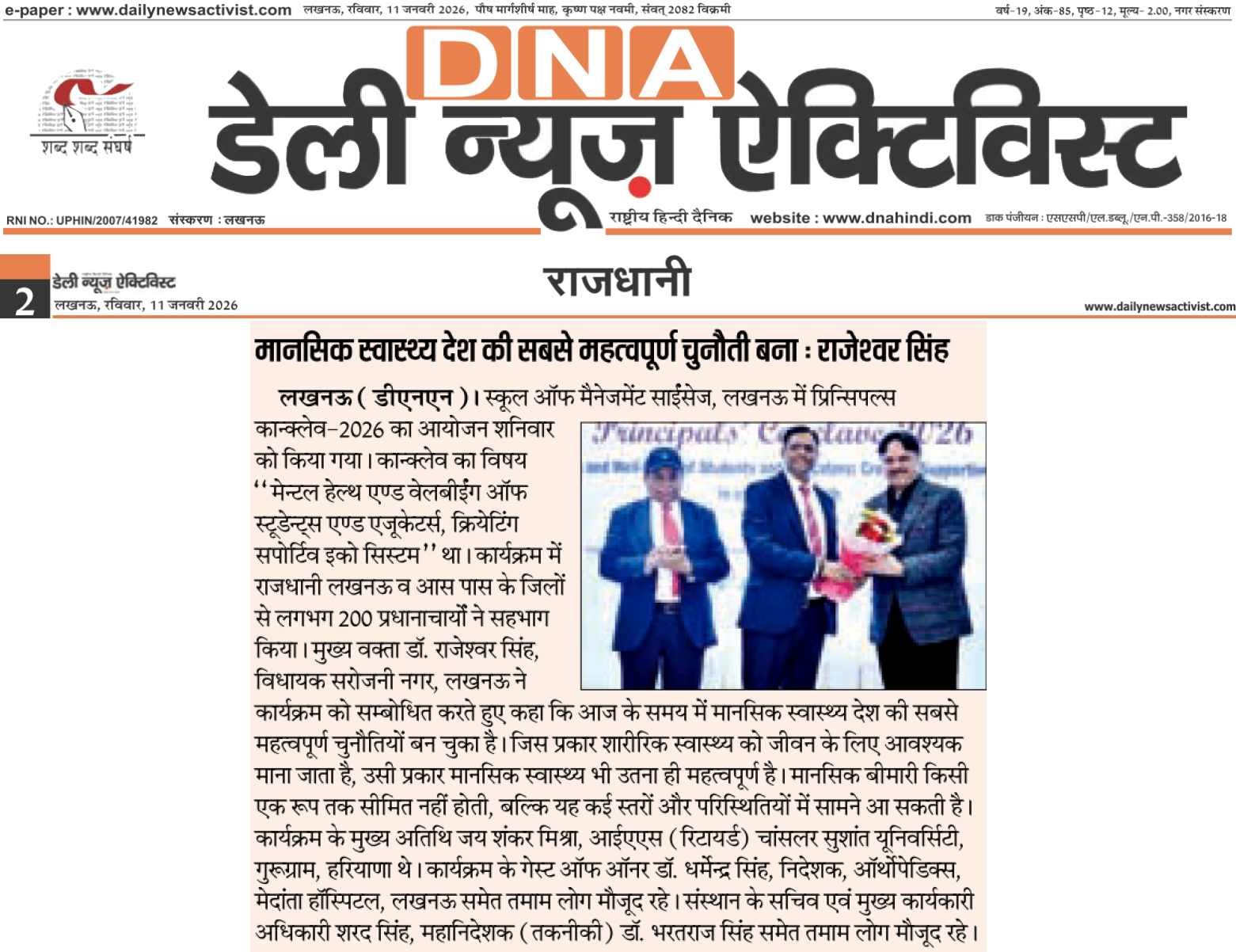 Lucknow. A Principals’ Conclave–2026: was organized on Saturday, 10 January 2026, at the School of Management Sciences, Lucknow. The theme of the conclave was Mental Health and Well-Being of Students and Educators: Creating a Supportive Ecosystem. Around 200 principals from Lucknow and nearby districts participated in the event.