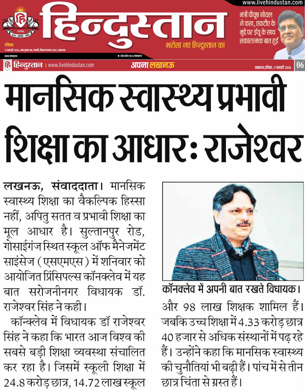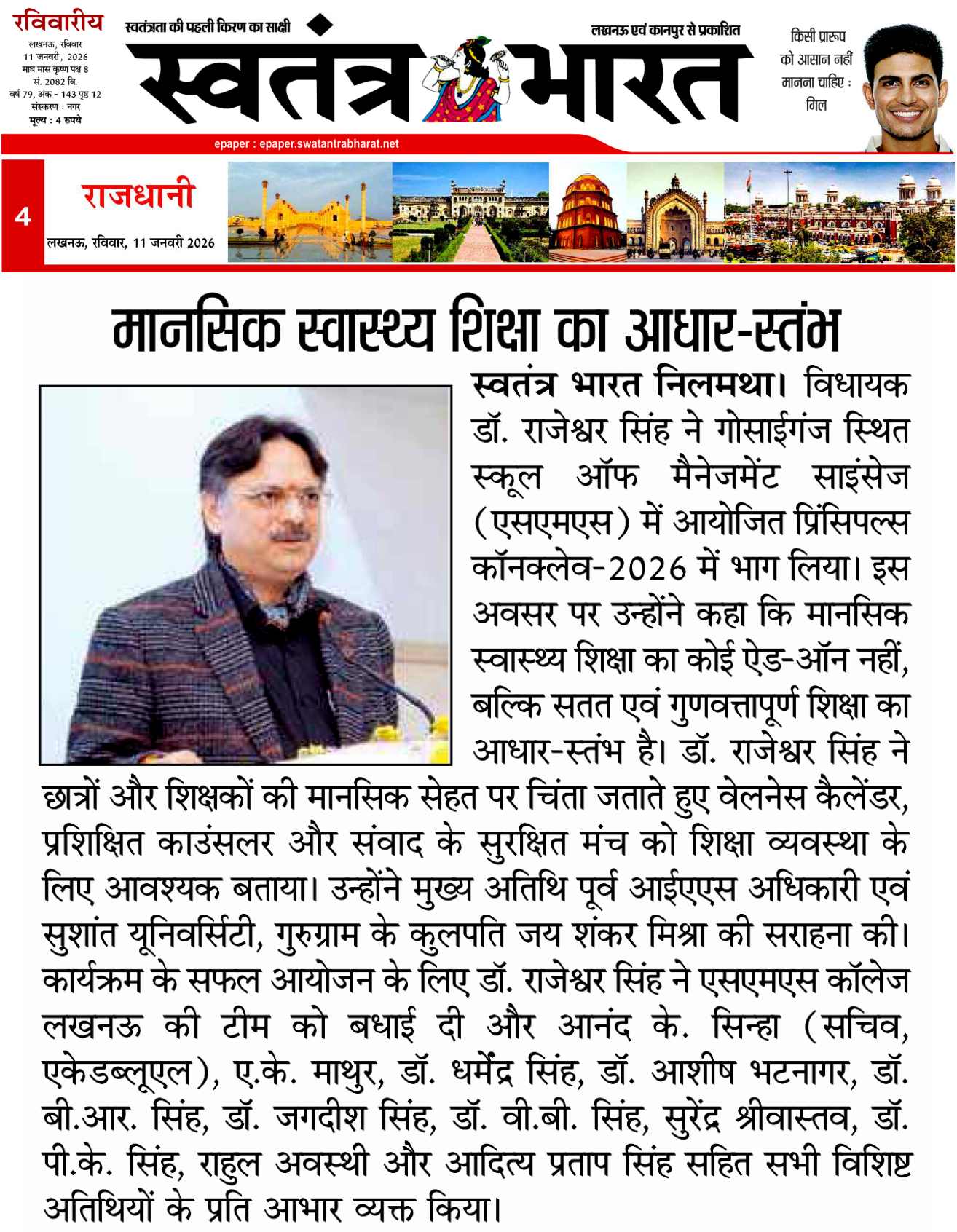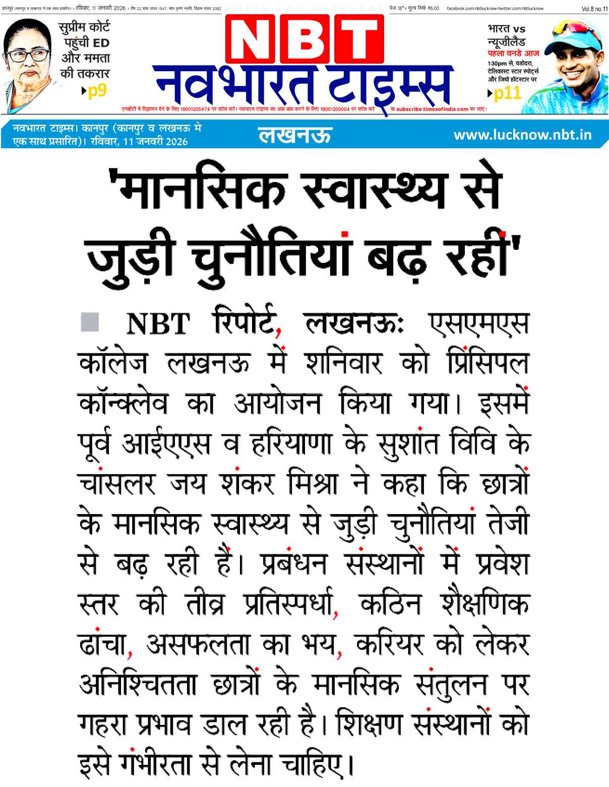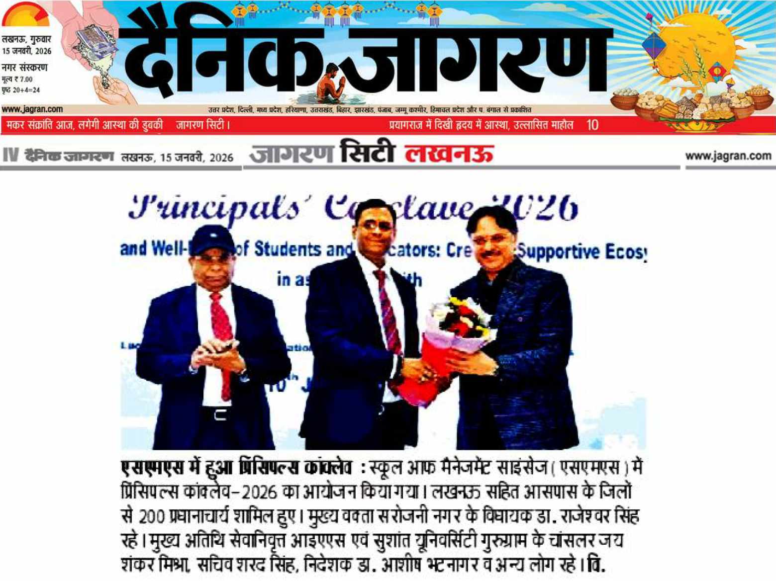 Lucknow. A Principals’ Conclave–2026: was organized on Saturday, 10 January 2026, at the School of Management Sciences, Lucknow. The theme of the conclave was Mental Health and Well-Being of Students and Educators: Creating a Supportive Ecosystem. Around 200 principals from Lucknow and nearby districts participated in the event.