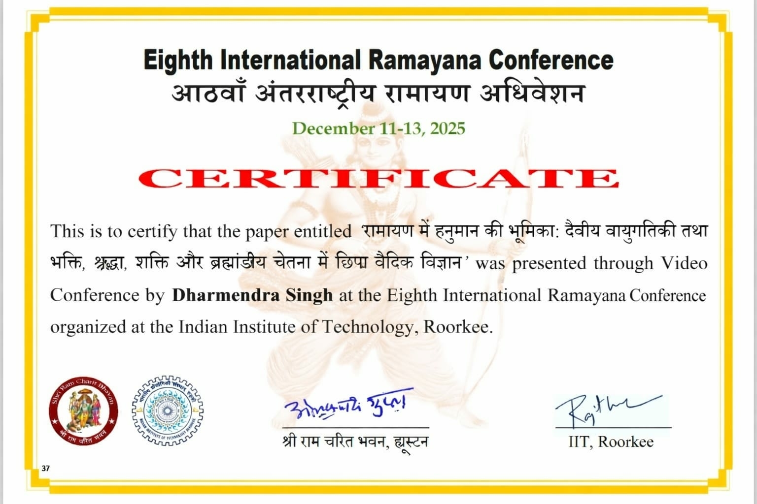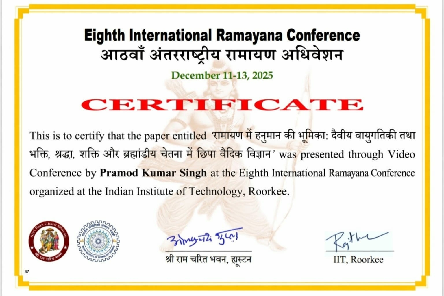 8th International Conference on Ramayan (IRC8) organised by Ram Charit Manas Bhawan, Houston, USA on 15-17 Dec 2025 Off Line at IIT-Roorkee and Online on 08-11 January 2026. Prof. Bharat Raj Singh alongwith Dr. Pramod Kumar Singh Dean-Students Wellfare & Dr. Asha Kulshreshtha HOD-CE presented their Paper-226 titiled: Ramayan Mein Hanuman Ki Bhumika