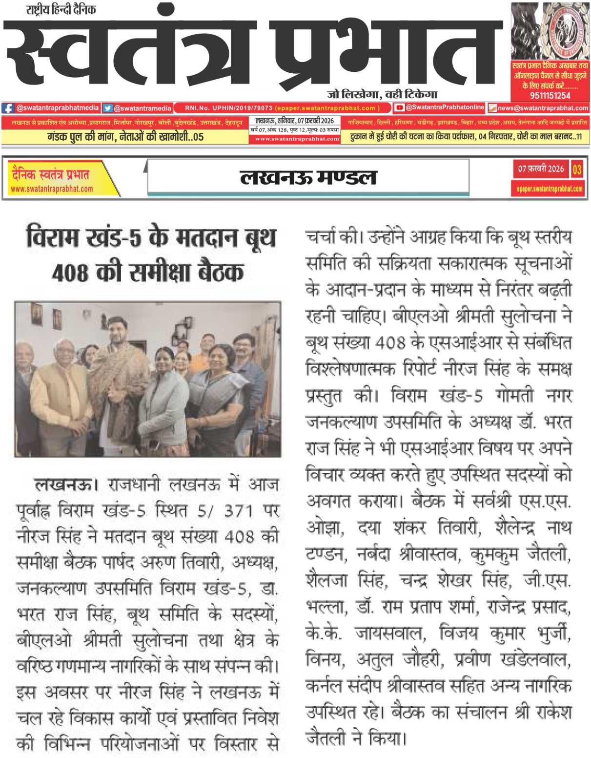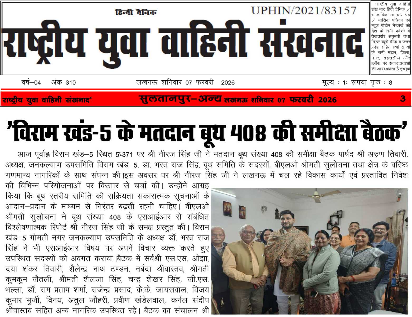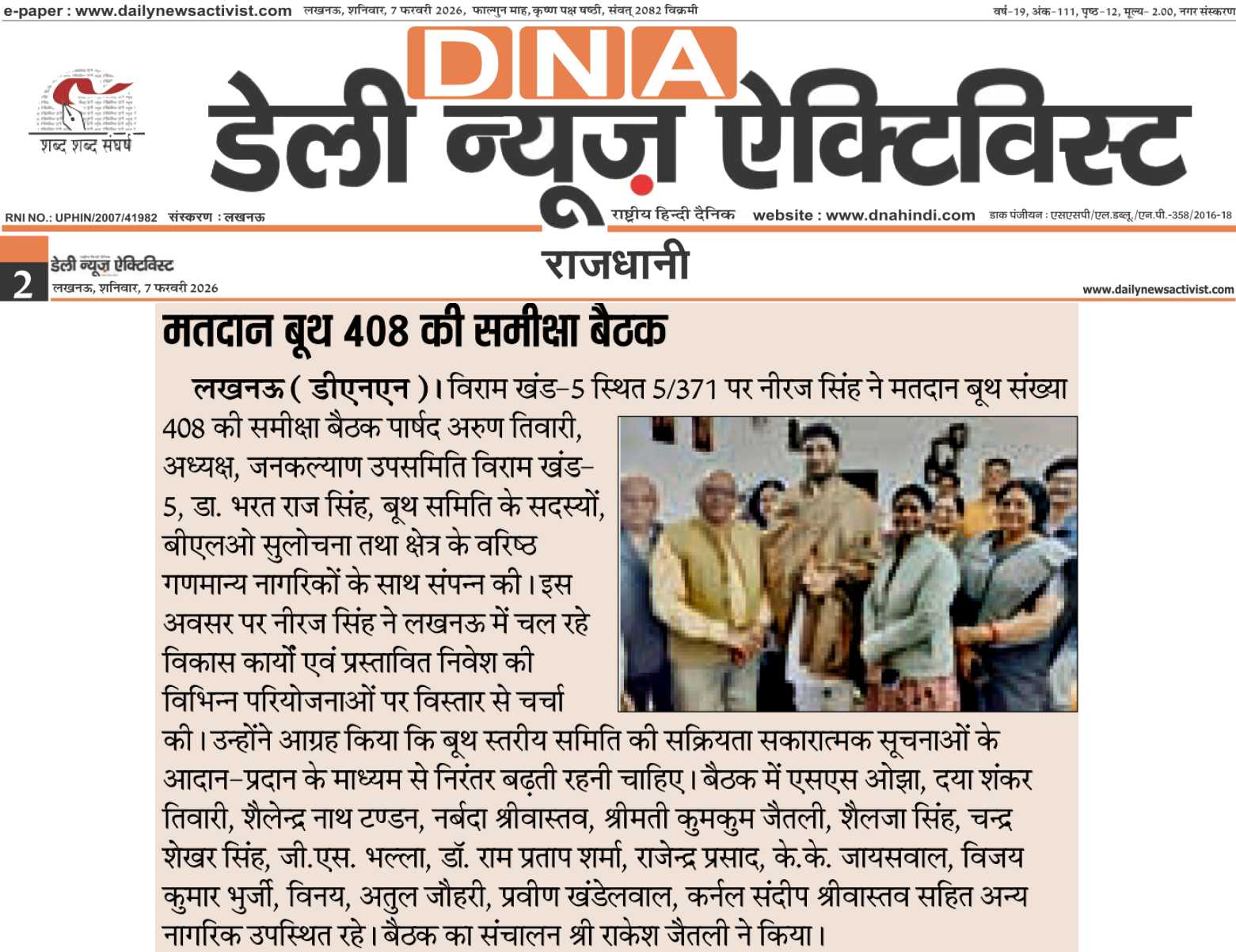 A review meeting of Polling Booth No. 408 was convened this forenoon at 5/371, Viram Khand-5, under the leadership of Shri Neeraj Singh, in the presence of Councillor Shri Arun Tiwari, Dr. Bharat Raj Singh, Chairman, Jan Kalyan Sub-Committee,Viram Khand-5, Booth Committee members, BLO Smt. Sulochana, and senior residents.Shri Neeraj Singh discussed ongoing development works and proposed investments in Lucknow, urging active booth coordination. BLO Smt. Sulochana presented an SIR report, followed by Dr. Bharat Raj Singh’s observations.The meeting was attended by Shri S. S. Ojha, Shri Daya Shankar Tiwari,