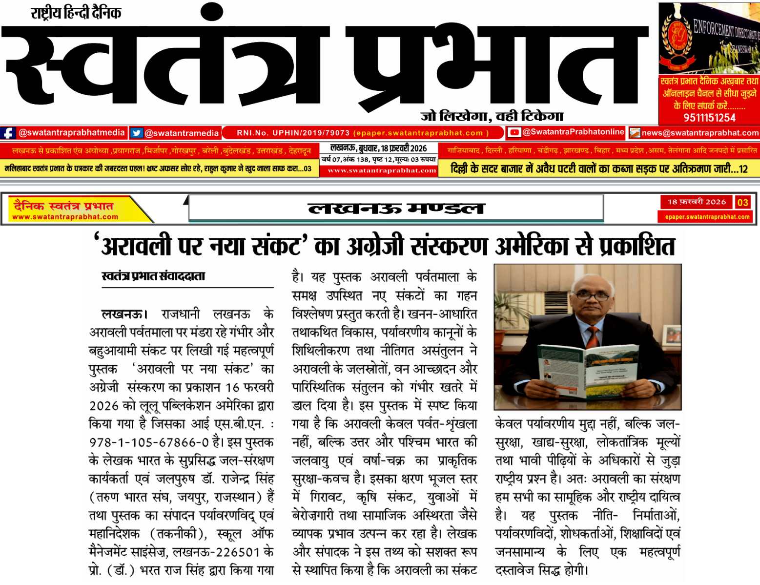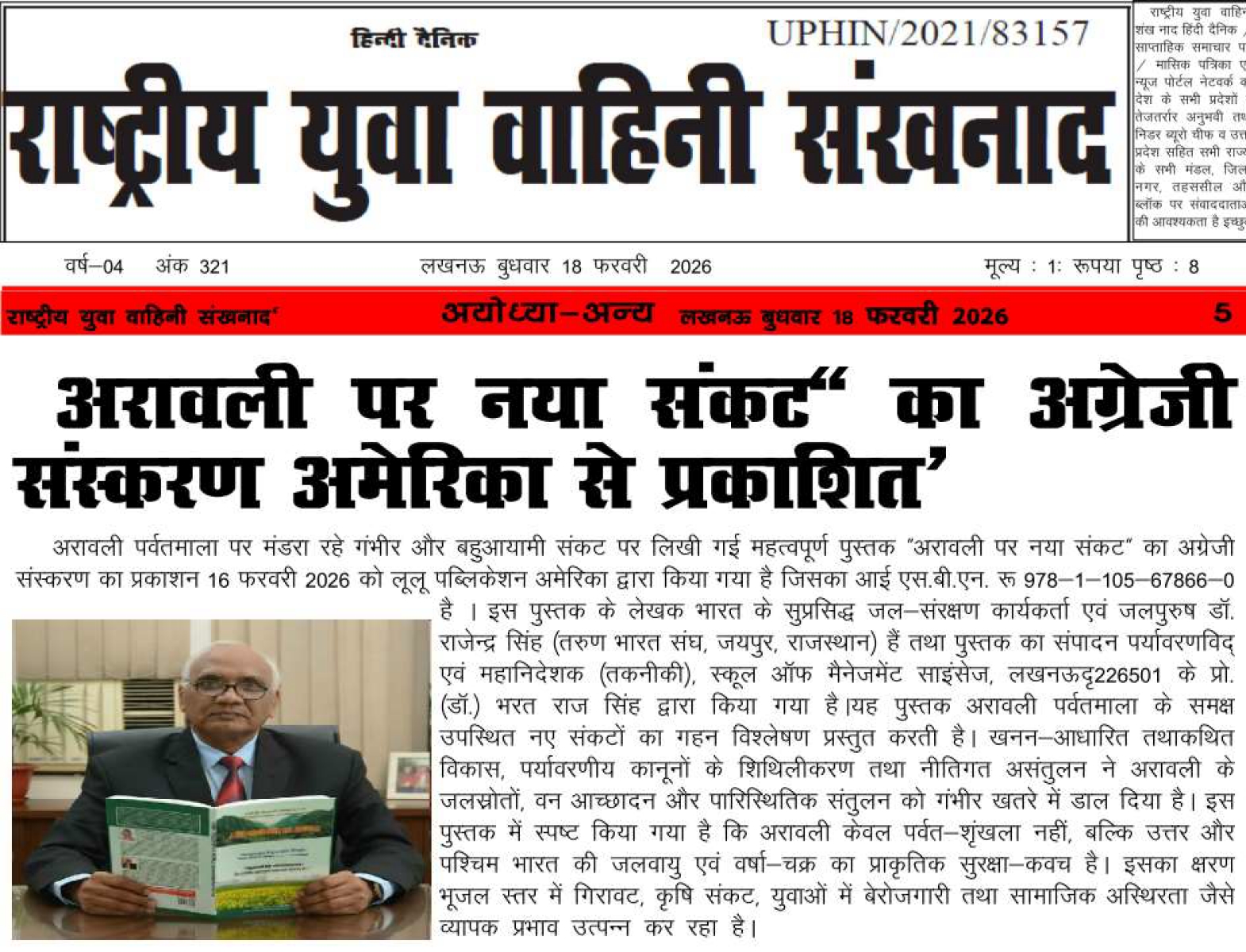 Book-Lulu-A New Crisis over Aravalli (English Version), ISBN: 978-1-105-67866-0, authored by: Waterman of India Dr. Rajendra Singh, Tarun Bharat Sangh, Jaipur, Rajasthan and edited by Prof. (Dr.) Bharat Raj Singh, Environmentalist & Director General(Tech), School of Management Sciences, Lucknow–226501, was Published by: Lulu Publication Inc., USA on 16 February 2026. This book draws serious attention to the new and multi-dimensional crisis looming