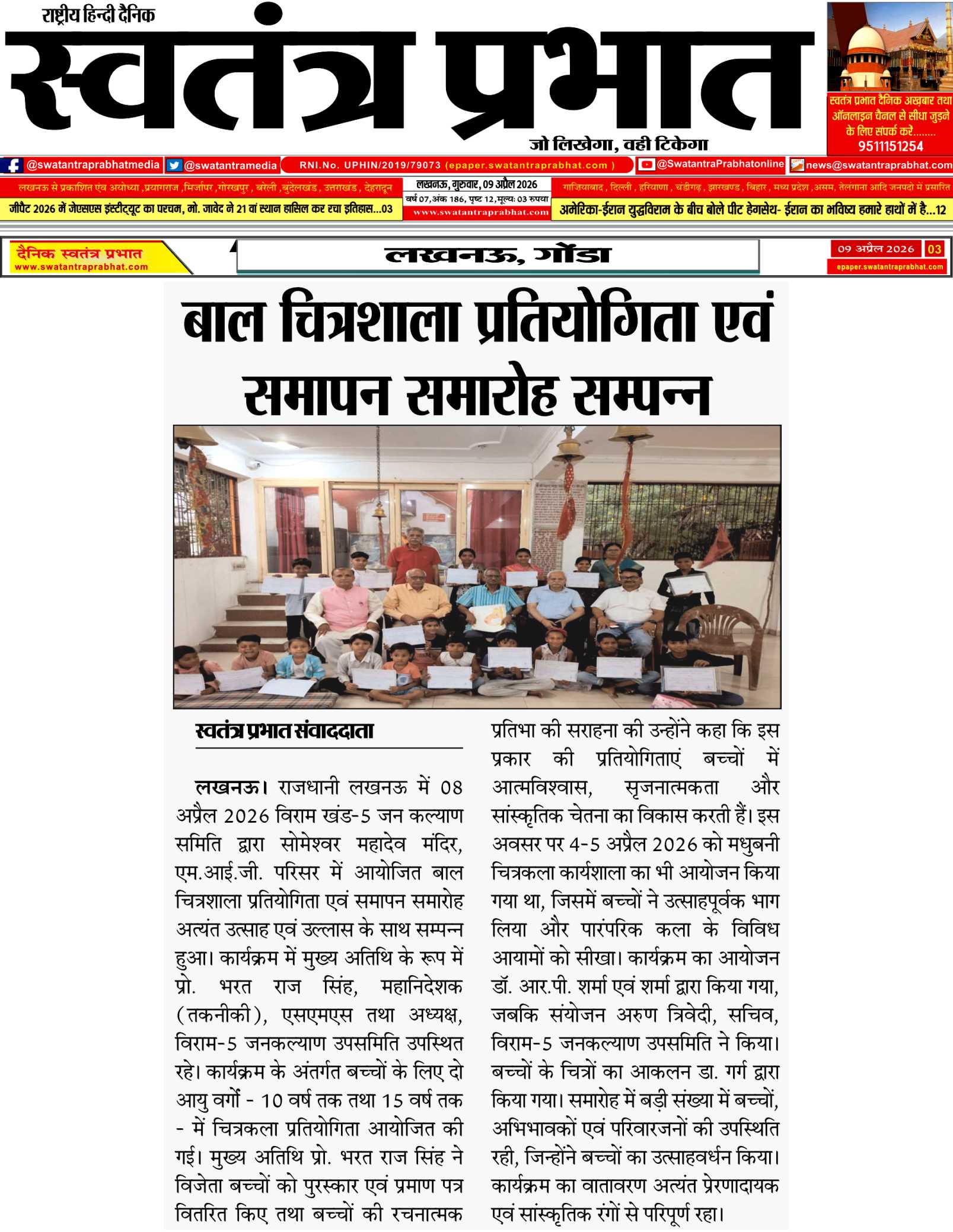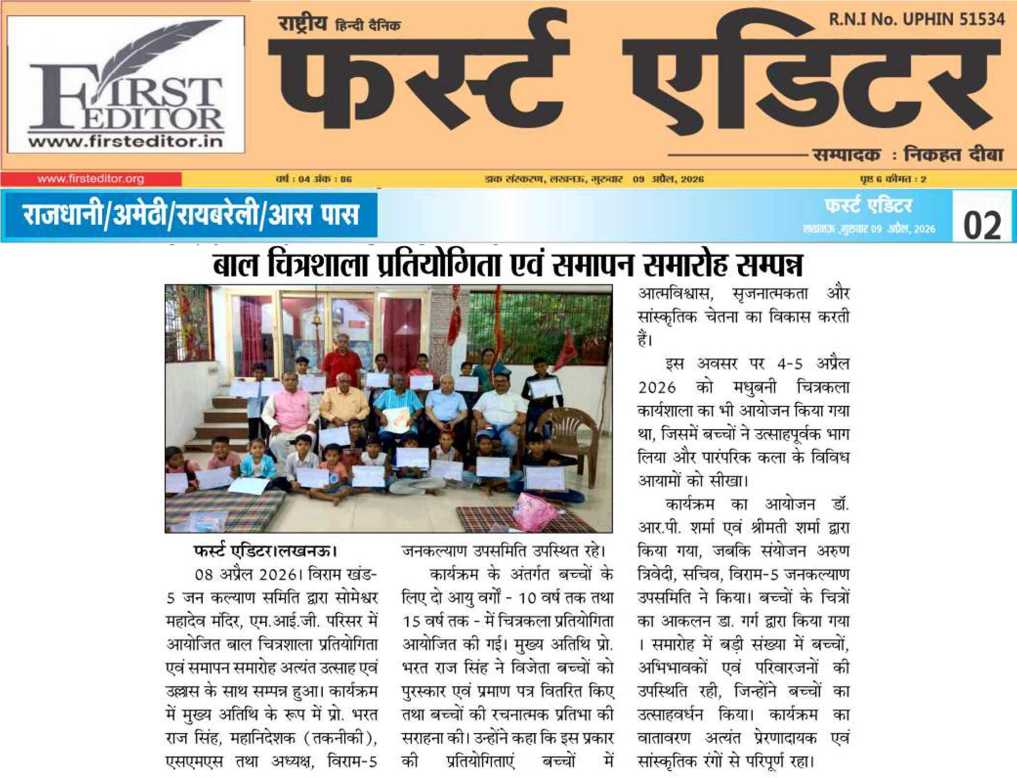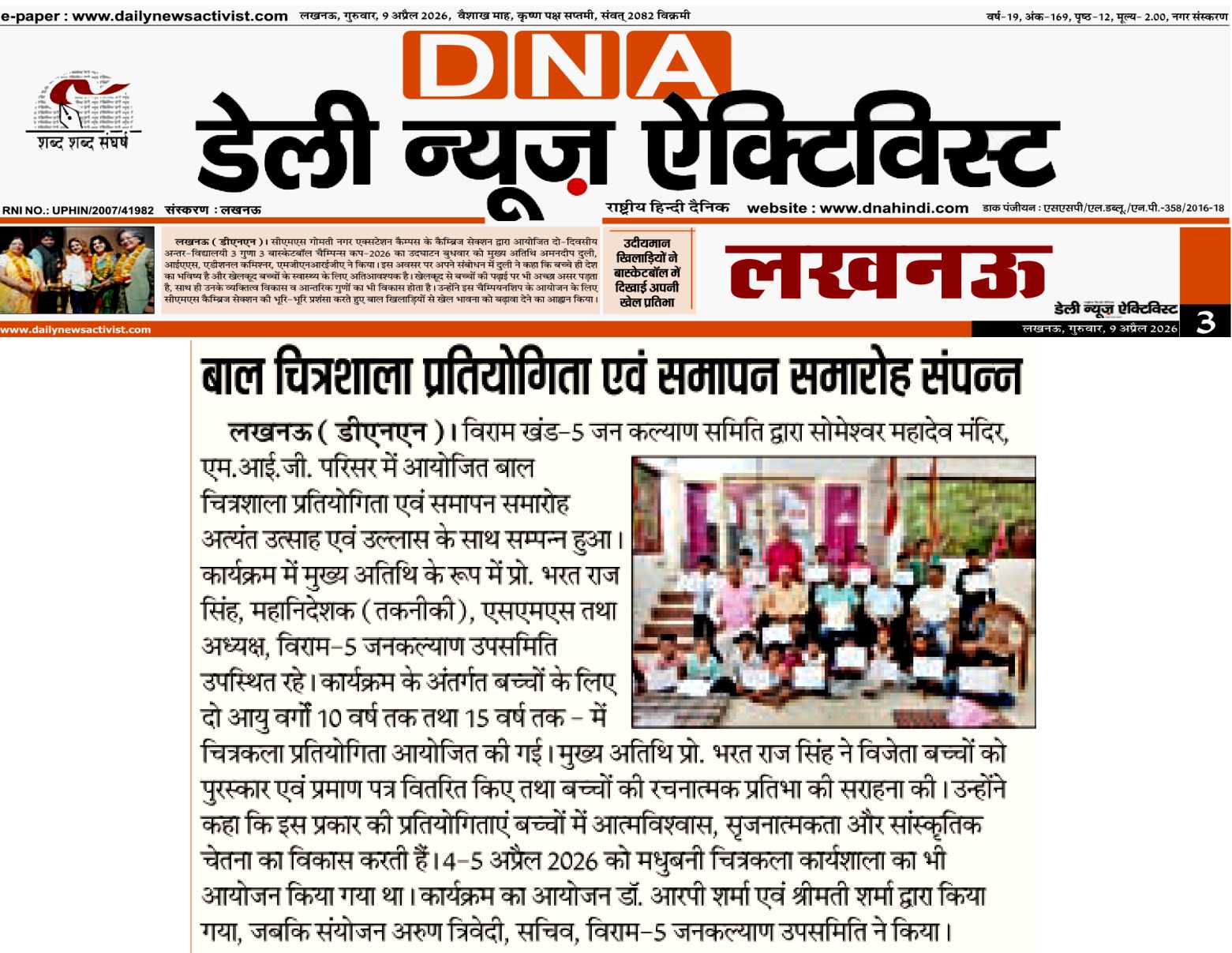 The Bal Chitrashala Competition and Valedictory Session, organised by Viram Khand-5 Jan Kalyan Samiti at Someshwar Mahadev Temple, M.I.G. premises, concluded successfully with great enthusiasm and participation on 05th April 2026. Prof. Bharat Raj Singh, Director General, SMS and Chairman, Viram-5 Jankalyan Upsamiti, attended the programme as the Chief Guest.