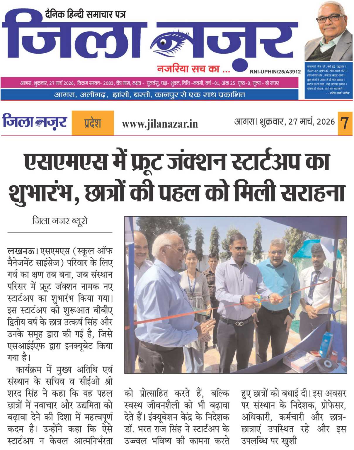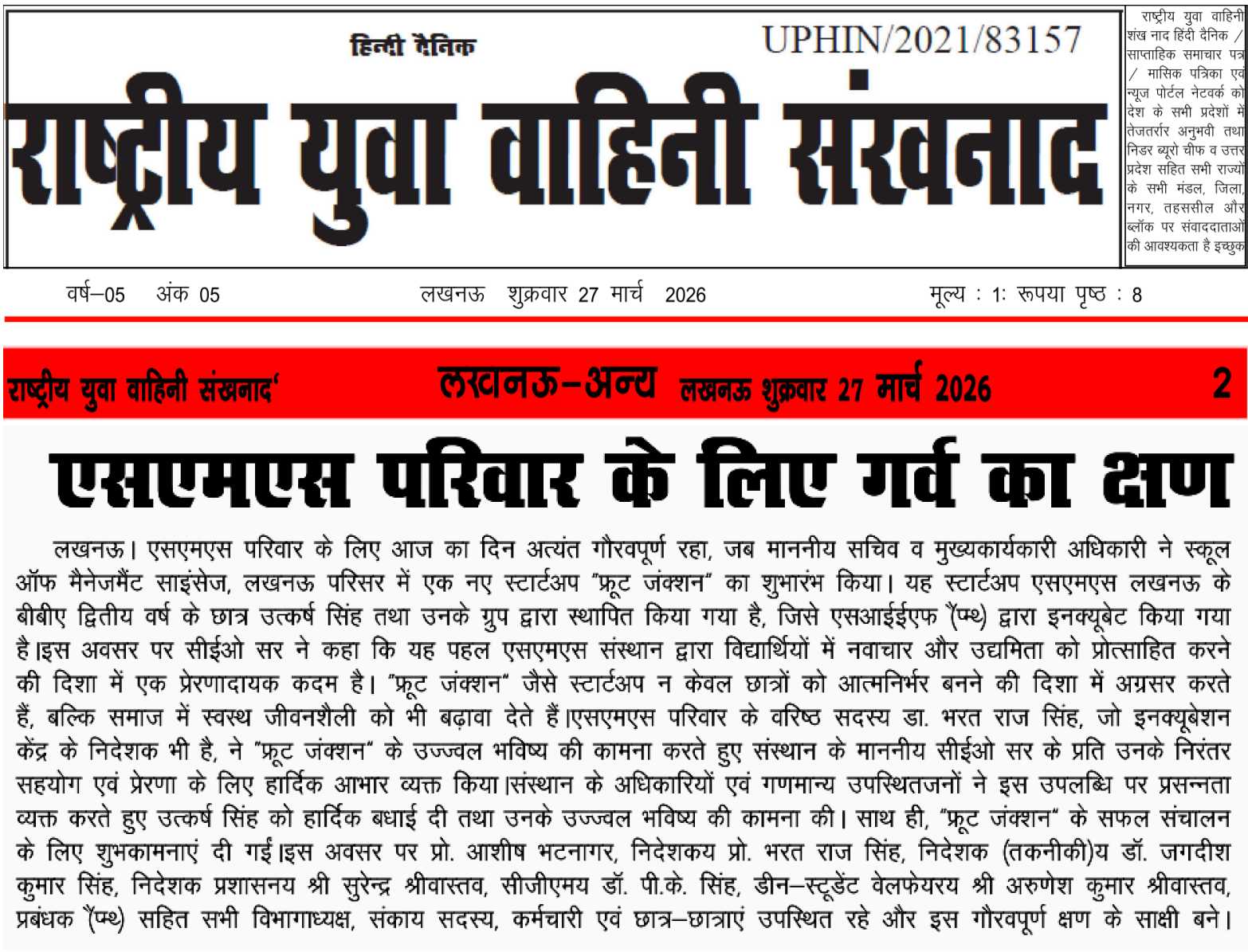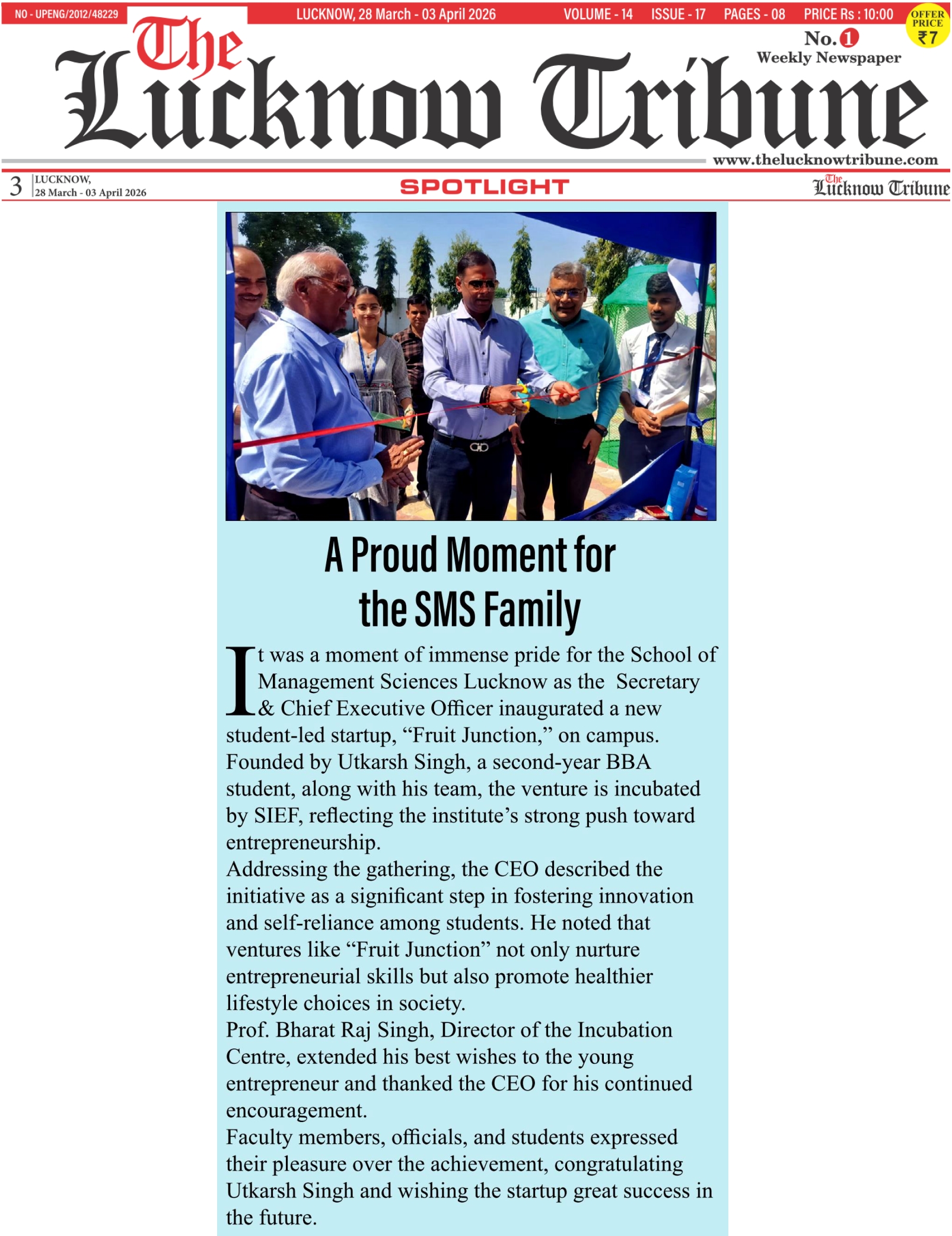 Great Pride to the SMS family as the Hon’ble Secretary & Chief Executive Officer, Shri Sharad Singh inaugurated a new startup, “Fruit Junction,†on 25 Mar 2026 (today) at the campus of the School of Management Sciences, Lucknow. The startup has been founded by Utkarsh Singh, a second-year BBA student of SMS Lucknow, along with his team, and is incubated by SIEF.On this occasion, the CEO described the initiative as an inspiring effort by SMS to foster innovation and entrepreneurship among students. Startups like “Fruit Junction†encourage